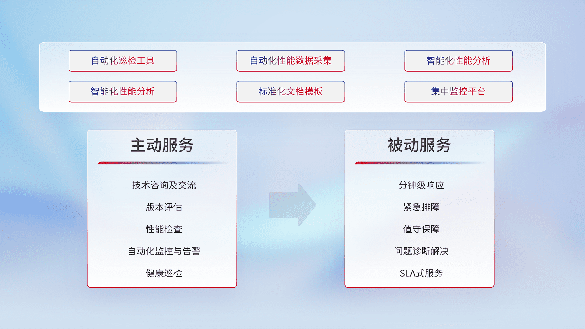 智能化工具和标准化文档,,保障服务质量,,,,提供主动服务(包含技术咨询、、、版本评估、、、性能检查、、、、自动化监控与告警、、、健康巡检)和被动服务包含(分钟级响应、、、紧急排障、、、、值守保障、、、、问题诊断解决、、SLA服务)。。。